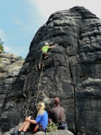 01.09.2001 12:00 | Der Kamin ist absolut harmlos und geradezu übersichert, die Wand danach eigentlich für sächsiche Verhältnisse normal gesichert (min. 2 Knotenschlingen und eine Plattenschlinge vorm Ring), der Ring steckt genau richtig. Das ! erscheint mir deutlich übertrieben. Und VIIa ist der Weg auch nicht wirklich. | ++ (sehr gut) |