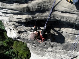 07.07.2001 18:50 | Achtung, habe heute (7.7.01) unterhalb des Bandes unterm Ring ein Wespennest entdeckt ... und die Wespen waren stinksauer über die Schlinge, die ich ihnen in ihr Loch zu stopfen versucht habe. Schneller Rückzug um 3 m war die Rettung, die Biester haben sich dann auch schnell beruhigt. Davon abgesehen eine schöne, eher leichte VIIa, kein Zwergentod. | + (gut) |